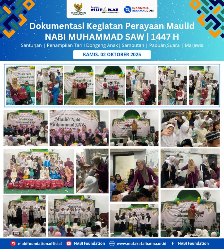 Kamis, 02 Oktober 2025 | Yayasan Mufakat Al-Banna Indonesia Untuk memperingati hari kelahiran Nabi Muhammad SAW, Yayasan Mufakat Al-Banna Indonesia menyelenggarakan Perayaan Maulid Nabi Muhammad SAW 1447 H pada Kamis, 2 Oktober 2025. Dalam acara ini, santri TKQ–TPQ Mufakat Indonesia, adik-adik PAUD TAAM Al-Banna, anak-anak yatim dan piatu, serta peserta Bimbel HEPI turut berpartisipasi dengan