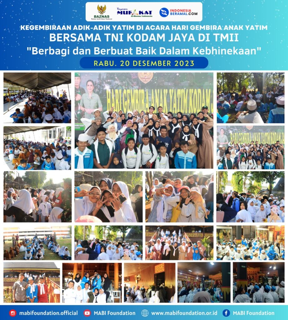 Alhamdulillah Adik-adik Yatim Mufakat Al Banna Indonesia, mendapatkan kesempatan berbahagia untuk hadir dalam acara “Hari Gembira Anak Yatim di Taman Mini Indonesia Indah dan dihadiri bersama Lembaga Sosial seluruh DKI Jakarta”. Acara ini diadakan pada hari Rabu 20 Desember 2023. Hari Anak Yatim bersama Kodam Jaya bukan hanya tentang memberi tetapi juga membangun kesadaran masyarakat akan keberadaan anak-anak yatim. Melalui kegiatan ini, diharapkan masyarakat semakin peduli dan terlibat dalam membantu menciptakan lingkungan yang mendukung pertumbuhan dan perkembangan mereka