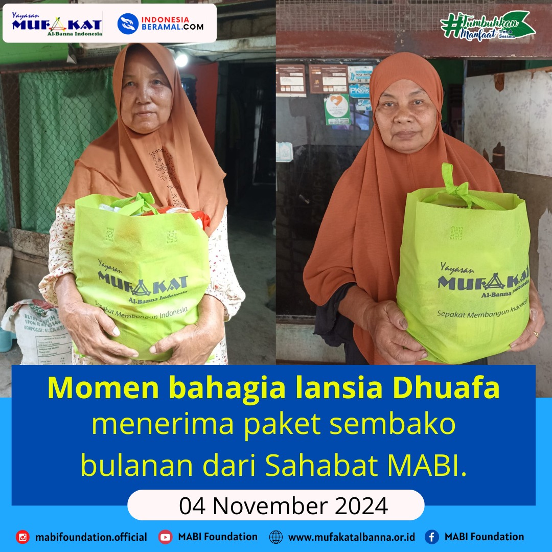 Donasi Sahabat MABI sudah kami Salurkan kepada para penerima manfaat yaitu Lansia Dhuafa dalam bentuk Sembako yang berisi Sembilan Kebutuhan Pokok keluarga. kami salurkan pada tanggal 04 November 2024 dan penyaluran berjalan dengan baik dan amanah