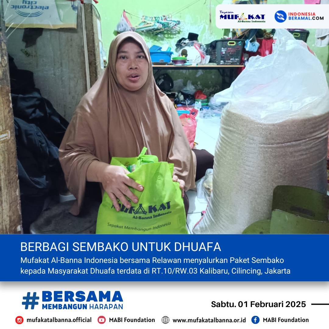 Pada hari Sabtu, 1 Februari 2025, Relawan Mufakat Al-Banna Indonesia telah menyalurkan paket sembako kepada masyarakat dhuafa di RT.10/RW.03. Kegiatan ini merupakan wujud kepedulian dan kebersamaan dalam membantu sesama yang membutuhkan.