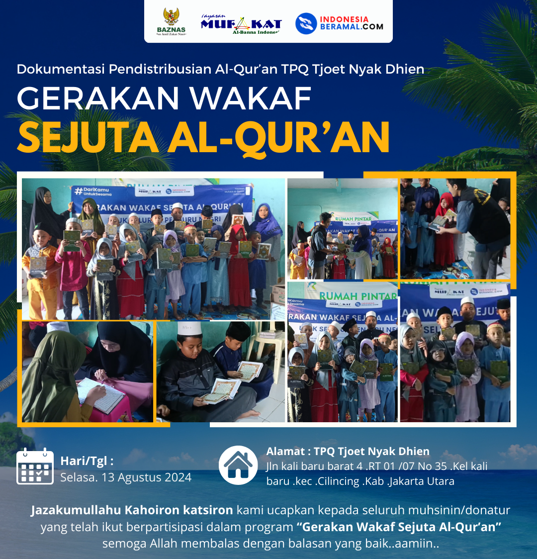 Pendistribusian Al-Qur'an yang Sahabat berikan di Yayasan Mufakat Al-Banna Indonesia. Pada hari Selasa, 13 Agustus 2024 kami mendistribusikan Al-Qur'an di TPQ Tjoet Nyak Dhien di daerah Kalibaru, Cilincing-Jakarta Utara.